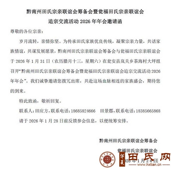 岁月流转,亲情弥坚。为传承田氏家族优良传统,凝聚宗亲力量,共话家族情谊,共谋发展愿景,黔南州田氏宗亲联谊会筹备会与瓮福田氏宗亲联谊会于2026 1 31 日(农历腊月十三,星期六)在瓮安县岚关乡茶海村大坪组召开“黔南州田氏宗亲联谊会筹备会暨瓮福田氏宗亲联谊会追宗交流活动2026年年会”。我们诚挚邀请您拨冗出席,共赴这场血脉相连的家族盛会,期待您的到来。