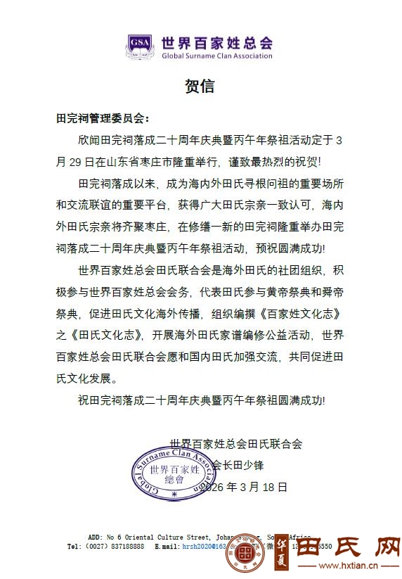 欣闻田完祠落成二十周年庆典暨丙午年祭祖活动定于329日在山东省枣庄市隆重举行,谨致最热烈的祝贺!