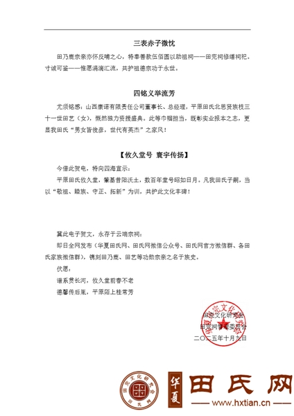 【攸久堂号 寰宇传扬】 今借此贺电,特向四海宣示: 平原田氏攸久堂,肇基昔阳沃土,数百年堂号昭如日月。凡我田氏子嗣,当以“敬祖、睦族、守正、拓新”为训,共护此文化丰碑!