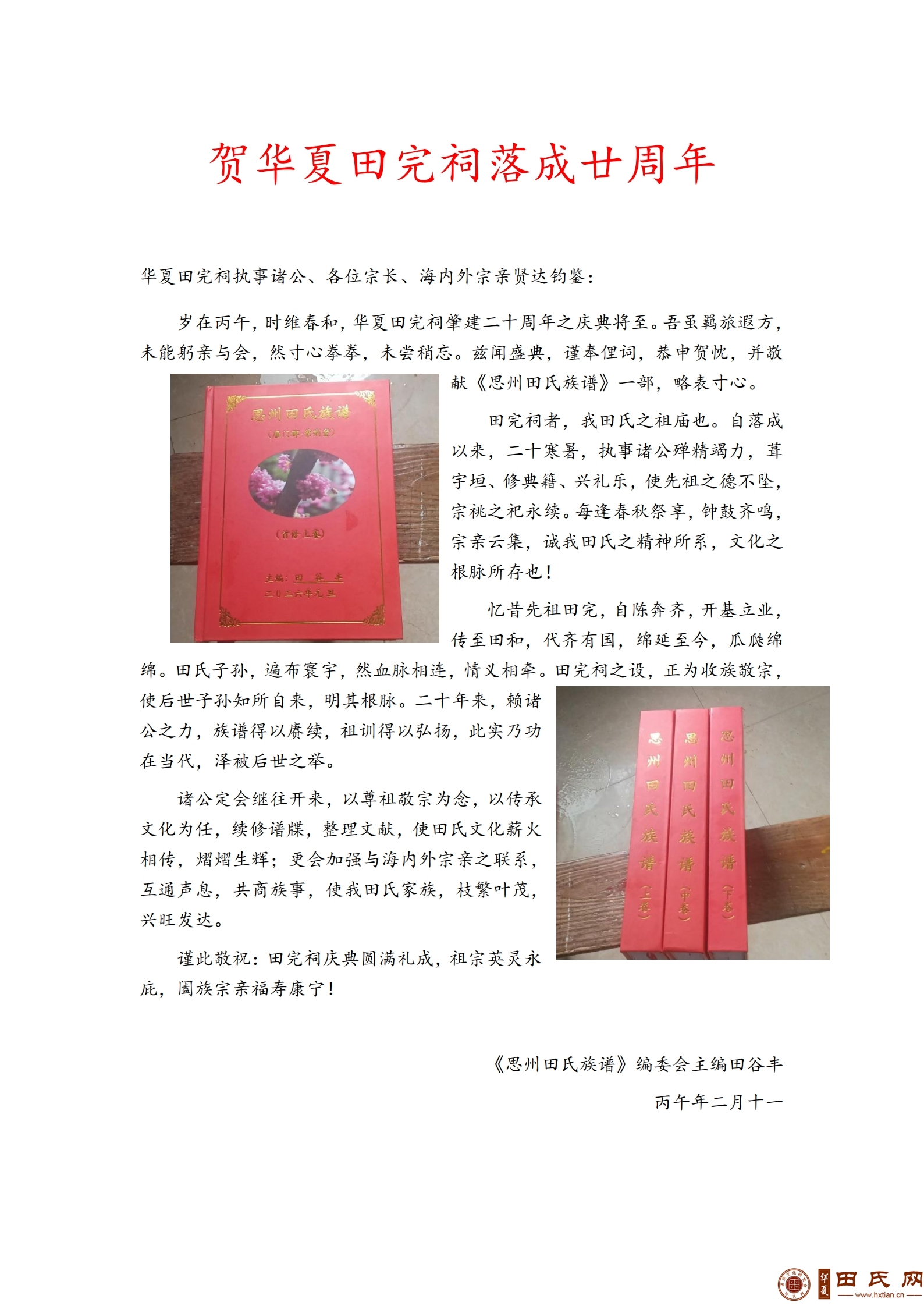 贺华夏田完祠落成廿周年——《思州田氏族谱》编委会主编田谷丰