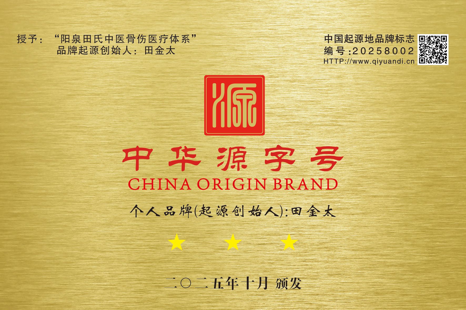 田金太于2025年向起源地文化(北京)传播中心标准化管理办公室提交申请,申请个人品牌:田金太,根据《中国起源地品牌通用评定标准》 T / OTOP 1019-2023、《关于申报2025年度中国起源地品牌评定项目的实施细则》等文件,经申报、材料审核、调研及评定、结果公示等工作流程及依据中华人民共和国国家版权局登记证书:
