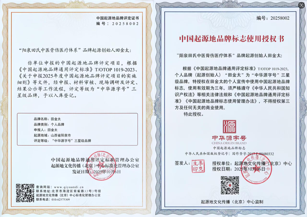 田金太评定等级为阳泉田氏中医骨伤医疗体系-创始人个人品牌"中华源字号”三星级品牌。