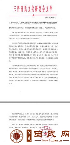 三晋田氏文化研究会关于田完祠落成廿周年庆典的贺辞尊敬的田完文化研究会、田完祠管理委员会各位同仁,海内外田氏宗亲: 值此华夏田氏始祖田完祠落成廿周年庆典之际,三晋田氏文化研究会谨以最诚挚的心意,向庆典的隆重举办致以热烈祝贺,向所有为田完祠修缮、发展付出心血的宗亲与各界贤达致以崇高敬意! 田完祠作为田氏宗亲的精神根脉之所,自2006年落成以来,始终承载着缅怀先祖、凝聚宗亲、传承文脉的厚重使命。廿载风雨兼程,它从一座纪念先祖的殿堂,逐渐成为联结四海田氏的情感纽带、弘扬中华优秀家族文化的重要阵地。2025年初,修缮倡议一经发出,便得到全国各地宗亲的热烈响应,各地宗亲慷慨解囊捐善款用于修缮,如今焕然一新的田完祠,不仅重现了昔日庄严肃穆的风貌,更彰显了田氏子孙敬祖睦族、传承赓续的赤子情怀。 三晋大地作为田氏分支的重要繁衍地,雁门堂等支脉始终以耕读传家、德泽绵长为训,而田氏先贤田子方“贫而无谄、富而无骄”的风骨,更成为贫骄堂、紫荆堂、积厚堂等各堂号宗亲共同恪守的精神坐标。此次田完祠廿周年庆典,更是让我们深刻感受到“天下田氏一家亲”的血脉深情。我们欣喜地看到,越来越多的田氏宗亲投身于家族文化传承事业,无论是慷慨解囊的无私奉献,还是奔走联络的热忱付出,都为田氏家族的发展注入了源源不断的动力。 站在新的历史起点,三晋田氏文化研究会愿与海内外宗亲一道,以田完祠为精神坐标,恪守“立德、立功、立言”之训,深挖田氏文化内涵,广结宗亲联谊纽带,让田完祠这一文化丰碑在新时代焕发出更加璀璨的光芒。 最后,衷心祝愿田完祠落成廿周年庆典圆满成功!祝愿天下田氏宗亲福寿安康、事业兴旺!祝愿田氏文脉薪火永续、万代绵长!